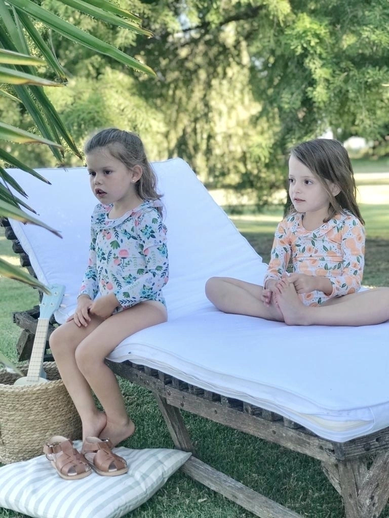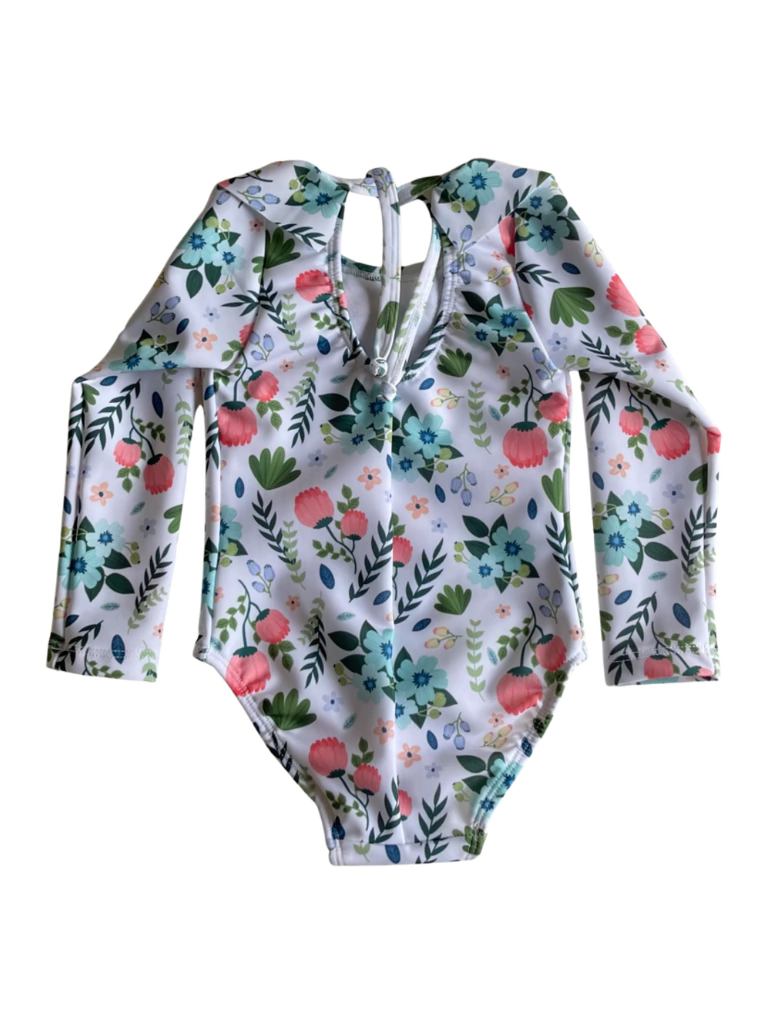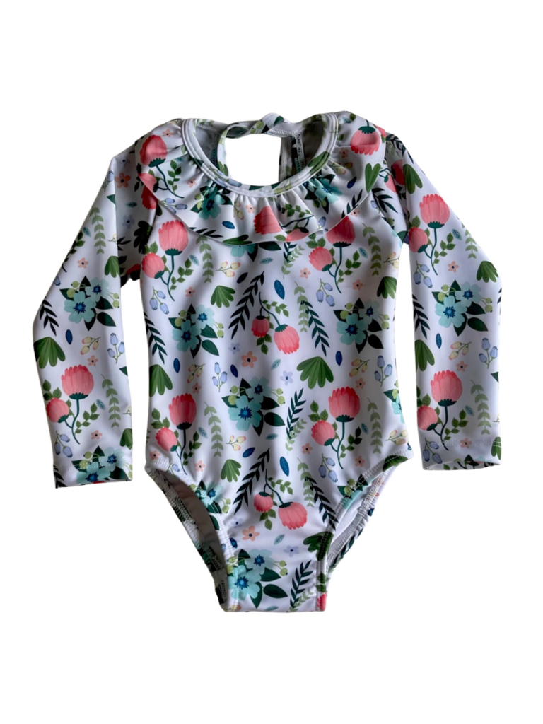 Traje de baño con manga larga, ideal para proteger a las peques del sol, evitando un paso de protectro solar, con un volado tan sweetie y elegante que enamora!